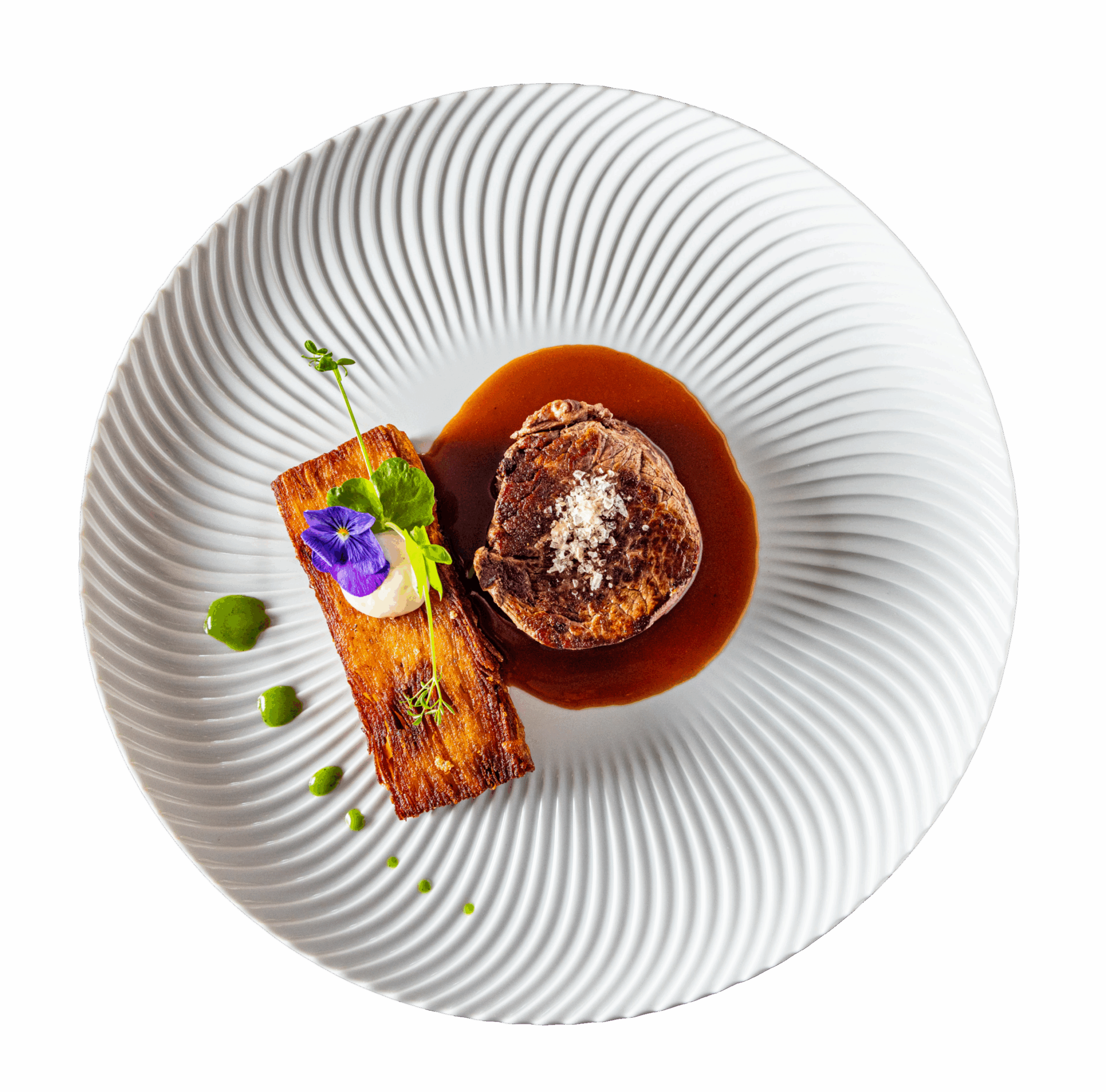 • Filet de bœuf Charolais, jus réduit à l’hibiscus, pressé de pommes de terre 33